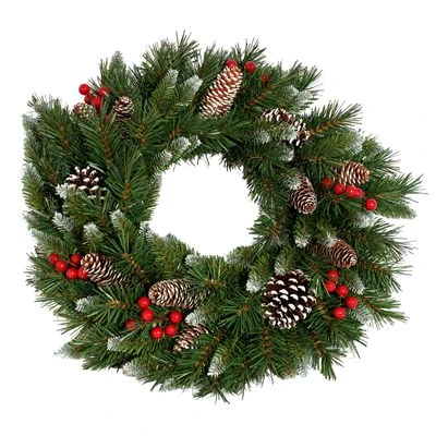 Versierd met rode bessen, dennenappels en sneeuw